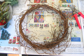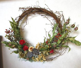 ノバラの実を刺し、足りないところに 二ゲラ、アナベルなどを付け足せば できあがりです。