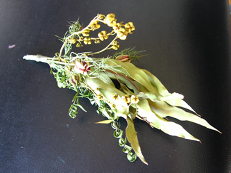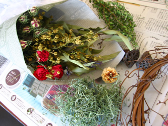 使った花材は、 レモンユーカリ、アップルユーカリ、 ローズメルセデス、ニゲラ、フィリカ、 マートル、アナベル、ルー、ノバラの実 ハスの実とさらしの松ぼっくり。