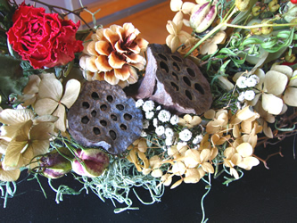 中央にローズメルセデス、はすの実、 松ぼっくりをつけ、白い小花のフィリカを ちりばめました。